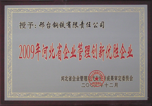 Xingtai Steel was awarded the Management Excellent Enterprise of  Hebei Province in 2009.