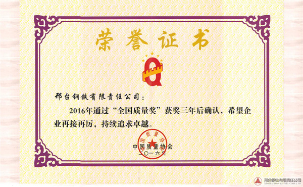 邢鋼于2013年獲得全國質(zhì)量獎(jiǎng),獲獎(jiǎng)后邢鋼繼續(xù)實(shí)踐《卓越績效評(píng)價(jià)準(zhǔn)則》,深入推進(jìn)卓越績效管理模式,持續(xù)改進(jìn),不斷追求卓越。2016年9月全國質(zhì)量獎(jiǎng)評(píng)審活動(dòng)領(lǐng)導(dǎo)小組組織專家對(duì)邢鋼進(jìn)行了全國質(zhì)量獎(jiǎng)獲獎(jiǎng)三年后的現(xiàn)場(chǎng)確認(rèn),通過專家小組的現(xiàn)場(chǎng)提問、材料匯報(bào)、生產(chǎn)現(xiàn)場(chǎng)的參觀,邢鋼順利通過了“全國質(zhì)量獎(jiǎng)”獲獎(jiǎng)三年后確認(rèn)并頒發(fā)證書。