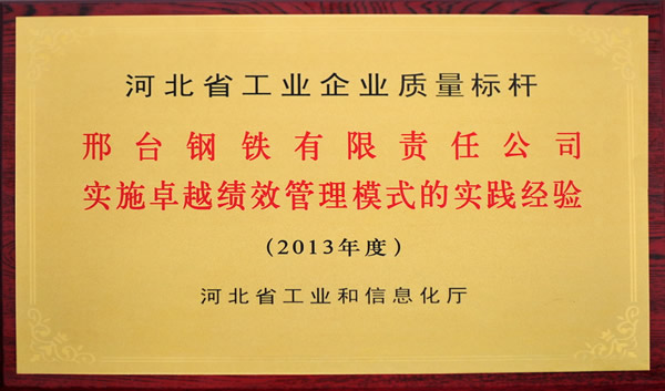 2013年7月12日,省工信廳在石家莊召開了2013年第五期國家新型工業(yè)化產(chǎn)業(yè)示范基地質(zhì)量標(biāo)桿經(jīng)驗(yàn)交流會,會上舉行了省質(zhì)量標(biāo)桿授牌儀式,邢鋼公司參加會議并接受了授牌。