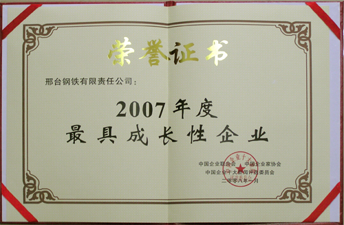 2008年1月,邢鋼榮獲由中國企業(yè)聯(lián)合會、中國企業(yè)家協(xié)會頒發(fā)的“2007年度最具成長性企業(yè)”榮譽稱號。