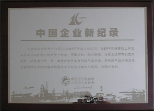 2006年11月,邢臺(tái)鋼鐵有限責(zé)任公司2005年整體上線運(yùn)行,在ERP系統(tǒng)基礎(chǔ)上開發(fā)實(shí)施條行碼技術(shù)在線材生產(chǎn)制造、質(zhì)量控制、庫存管理、銷售發(fā)運(yùn)環(huán)節(jié)的應(yīng)用項(xiàng)目,項(xiàng)目運(yùn)行后每一條線材都帶有條型碼產(chǎn)品標(biāo)牌,條型碼產(chǎn)品標(biāo)牌記錄該盤線材全部的質(zhì)量和數(shù)量信息及制造過程中的信息,為國(guó)內(nèi)首創(chuàng)。