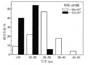 1600℃時(shí),圖1中夾雜物尺寸分別為24μm和11.5μm。鋼中初始氧含量(質(zhì)量分?jǐn)?shù))從48×10-6降低到12×10-6時(shí),粒度為0-10μm和10-20μm夾雜物所占比例成倍增加,粒度為20-30μm夾雜物所占比例降低到5%左右,粒度大于30μm的夾雜物消失。降低鋼水鋁脫氧過程的初始氧含量可降低脫氧溶質(zhì)元素的過飽和度,從而增加鋼中小于20μm夾雜物的比例.