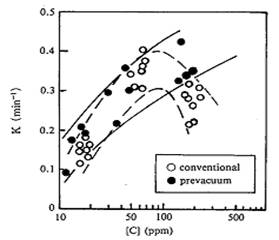 新日鐵名古屋廠的實踐證實,預(yù)抽真空可以消除初始階段脫碳速率的滯止,使脫碳速率在RH開始處理后迅速達(dá)到高的水平,如下圖所示。預(yù)抽真空循環(huán)開始的時間要比沒有預(yù)抽縮短0.5min。