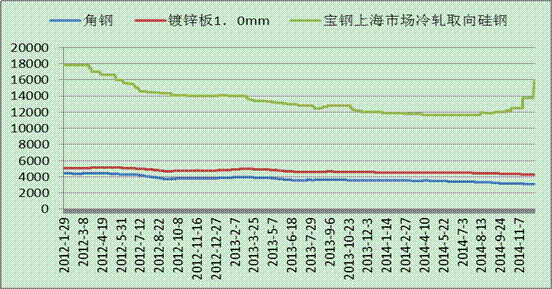 據(jù)鋼聯(lián)資訊跟蹤的部分電網(wǎng)建設(shè)用鋼價(jià)格走勢(shì)顯示,近3年來(lái),由于鋼鐵產(chǎn)能的嚴(yán)重過剩以及下游投資建設(shè)需求的回落,鋼材價(jià)格一路持續(xù)下跌。其中用于變壓器的冷軋取向硅鋼價(jià)格從最高17800元/噸跌至13800元/噸,跌幅達(dá)22.5%,其中最低跌至11600元/噸。角鋼價(jià)格亦從最高4435元/噸跌至3094元/噸,鍍鋅板價(jià)格從最高5052元/噸下跌至4267元/噸,跌幅分別達(dá)30.2%和15.5%。從圖中可以看出,三個(gè)品種的價(jià)格在2012年跌幅相對(duì)較大。此后,價(jià)格逐步呈現(xiàn)陰跌的走勢(shì),跌幅有所收窄,冷軋取向硅鋼價(jià)格在特高壓政策利好之下,率先小幅拉升,其他兩個(gè)品種鋼材因使用面廣,依舊維持震蕩走勢(shì)。