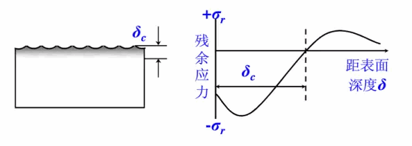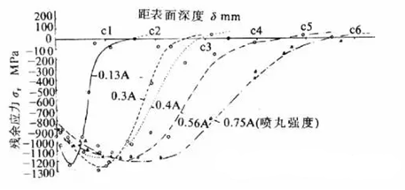 噴丸強化影響工件表面深度取決于工作自身強度,工件自身強度越高,影響深度越小。通常影響深度為0.1-0.8mm。下圖是高強鋼(σb=1900MPa)噴丸殘余應力分布曲線,圖中可見噴丸強度由0.13Amm增高至0.75Amm,導致δc由0.15mm增至0.55mm,但表面殘余應力和最大殘余應力變化不明顯。