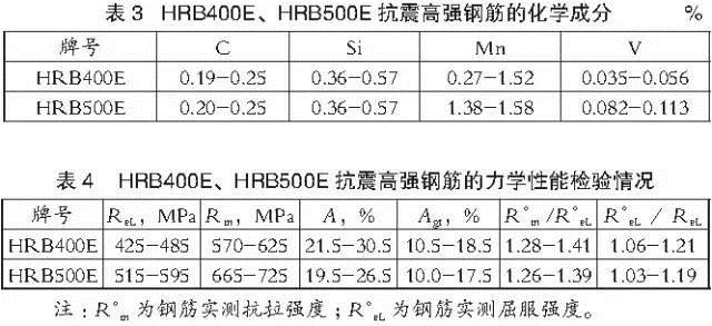 我國在GB 1499.2-2007標(biāo)準中首次將鋼筋的抗震性能指標(biāo)納入國標(biāo)中,并規(guī)定了抗震鋼筋的三個代表性指標(biāo):強屈比(R?m /R?eL)、超屈比(R?eL/ReL)和最大力總伸長率(Agt)。國內(nèi)某鋼廠HRB400E、HRB500E抗震鋼筋多樣品檢驗獲得的化學(xué)成分和力學(xué)性能指標(biāo)見表3和表4。