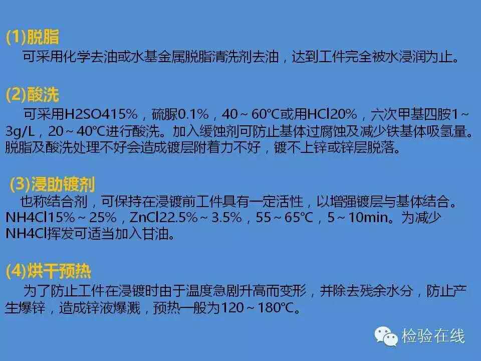 工件→脫脂→水洗→酸洗→水洗→浸助鍍?nèi)軇?rarr;烘干預(yù)熱→熱鍍鋅→整理→冷卻→鈍化→漂洗→干燥→檢驗(yàn)