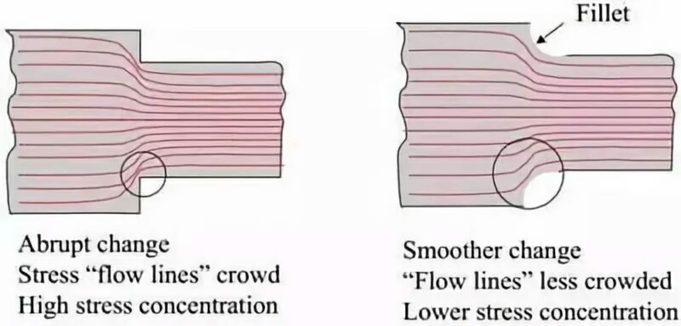 實際上,所有的疲勞失效都發(fā)生在應(yīng)力集中點(diǎn)或應(yīng)力集中處的零件的外表面上。例如,凹槽、圓角、孔、螺紋、鍵槽、花鍵、焊縫等。如果該部件提供長期無故障的服務(wù),設(shè)計者必須考慮到這些應(yīng)力提升器的影響。應(yīng)力集中的作用直接與其半徑小有關(guān)。與先前提到的促進(jìn)疲勞失效的微裂紋一樣,應(yīng)力發(fā)生位置的半徑越小,產(chǎn)生的應(yīng)力越集中越大。有趣的是,應(yīng)力集中對高延展性的金屬影響很小。其解釋是,由幾何變化引起的應(yīng)力集中被限制在屈服應(yīng)力,止于塑性變形。