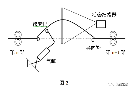 活套是用來檢測和調(diào)節(jié)相鄰機(jī)架間速度關(guān)系從而實(shí)現(xiàn)無張力軋制的設(shè)備?;钐字饕苫钐讙呙杵?、起套輥及其調(diào)節(jié)器等組成,結(jié)構(gòu)如(圖2)所示。主要作用是根據(jù)檢測的套位信號(hào)來控制上游軋機(jī)的速度,實(shí)現(xiàn)自動(dòng)控制系統(tǒng)。