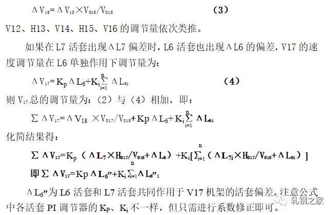當(dāng)活套一旦形成以后,活套的實(shí)際高度立即由活套掃描器測得的值經(jīng)過PI調(diào)節(jié)器,輸出一個(gè)控制信號(hào),通過控制上游軋機(jī),使活套大小得到調(diào)節(jié),使活套保持在設(shè)定的高度范圍。速度調(diào)節(jié)量是按逆流調(diào)速的方法,按同樣比例對(duì)軋機(jī)的工作速度進(jìn)行級(jí)聯(lián)調(diào)節(jié)。假如活套L7出現(xiàn)高度差為ΔL7,則V18機(jī)架的速度調(diào)節(jié)是: