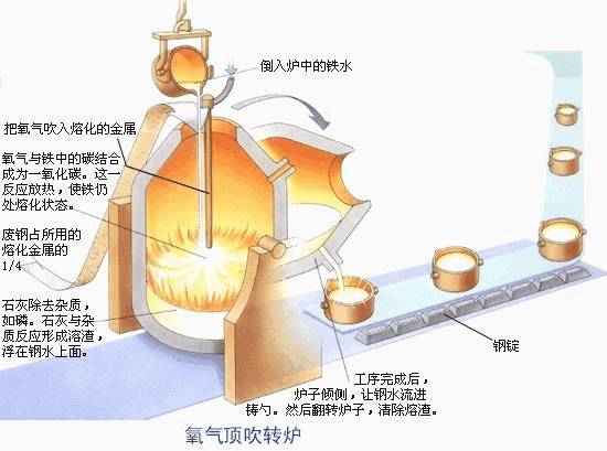 生鐵中的各種雜質(zhì),在高溫下,在不同程度上都與氧有較大的親和力。因此可以利用氧化的方法使它們成為液體、固體或氣體氧化物,液體和固體氧化物在高溫下與爐襯和加入爐內(nèi)的熔劑起作用,結(jié)合成爐渣,并在扒渣時(shí)被排除爐外,氣體也在鋼水沸騰時(shí)被CO帶到爐外。