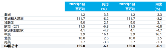 2022年1月全球64個納入世界鋼鐵協(xié)會統(tǒng)計國家的粗鋼產(chǎn)量為1.550億噸,同比下降6.1%。