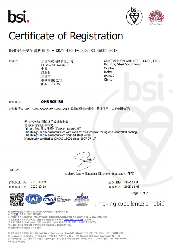 In order to carry out the concept of continuous improvement and continuously strengthen the safety and environmental protection, from 22nd to 26th in August, 8 experts from BSI (British Standards Institute) were invited to conduct a 5-day audit on the operation of Occupational Health and Safety Management System (ISO45001:2018) and Environmental Management System (ISO14001:2015). The audit team gave full affirmation and high evaluation to our progress on the work of occupational health and environmental protection, and also put forward guidance and suggestions for improvement. For the problems in operating system, the relevant departments will analyze the root causes, make a corrective action plan and learn by analogy to achieve the continuous improvement of the safety and environmental system, which is highly praised by the experts. As expected, Xingtai Steel successfully passed the certification of Safety and Environment System issued by BSI. Until now, Xingtai Steel has passed the certification of Safety and Environment System issued by BSI for 16 consecutive years.