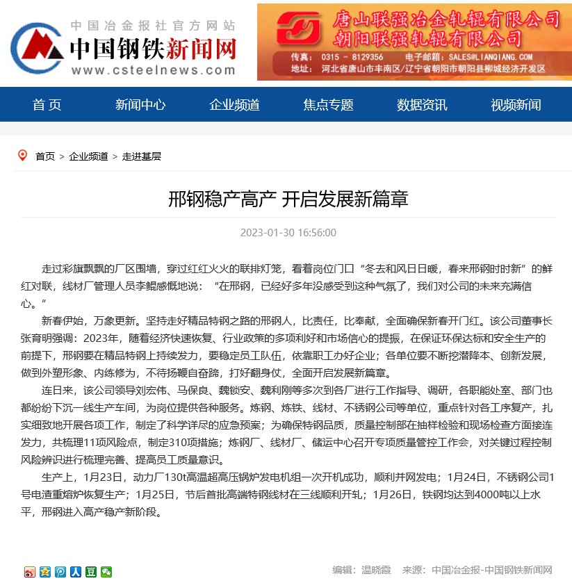 新春伊始,萬象更新。堅持走好精品特鋼之路的邢鋼人,比責任,比奉獻,全面確保新春開門紅。該公司董事長張育明強調(diào):2023年,隨著經(jīng)濟快速恢復、行業(yè)政策的多項利好和市場信心的提振,在保證環(huán)保達標和安全生產(chǎn)的前提下,邢鋼要在精品特鋼上持續(xù)發(fā)力,要穩(wěn)定員工隊伍,依靠職工辦好企業(yè);各單位要不斷挖潛降本、創(chuàng)新發(fā)展,做到外塑形象、內(nèi)練修為,不待揚鞭自奮蹄,打好翻身仗,全面開啟發(fā)展新篇章。