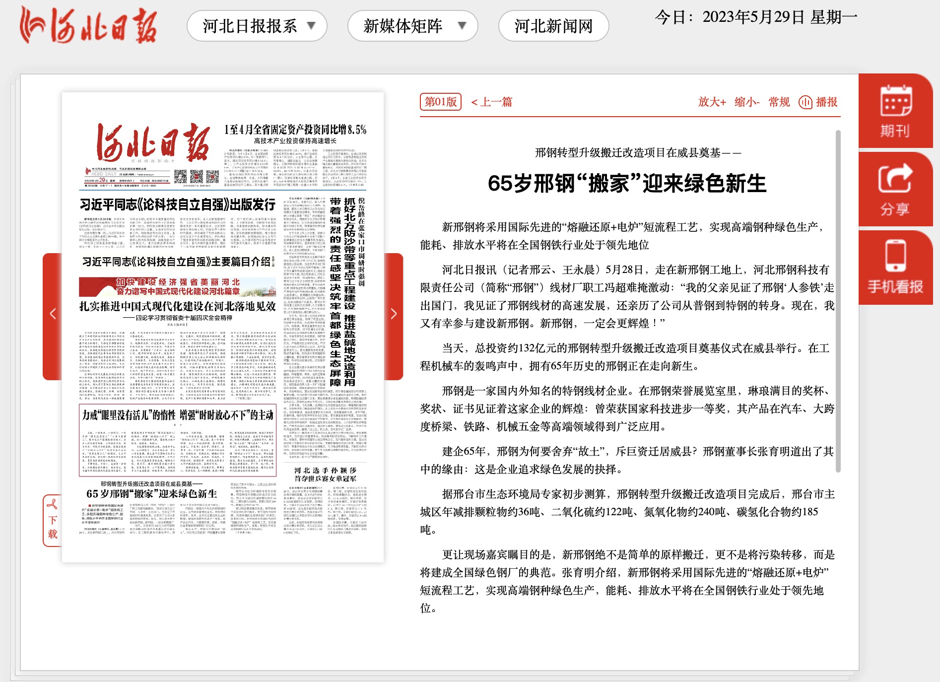 河北日報(bào)訊(記者邢云、王永晨)5月28日,走在新邢鋼工地上,河北邢鋼科技有限責(zé)任公司(簡稱“邢鋼”)線材廠職工馮超難掩激動(dòng):“我的父親見證了邢鋼‘人參鐵’走出國門,我見證了邢鋼線材的高速發(fā)展,還親歷了公司從普鋼到特鋼的轉(zhuǎn)身?,F(xiàn)在,我又有幸參與建設(shè)新邢鋼。新邢鋼,一定會(huì)更輝煌!”